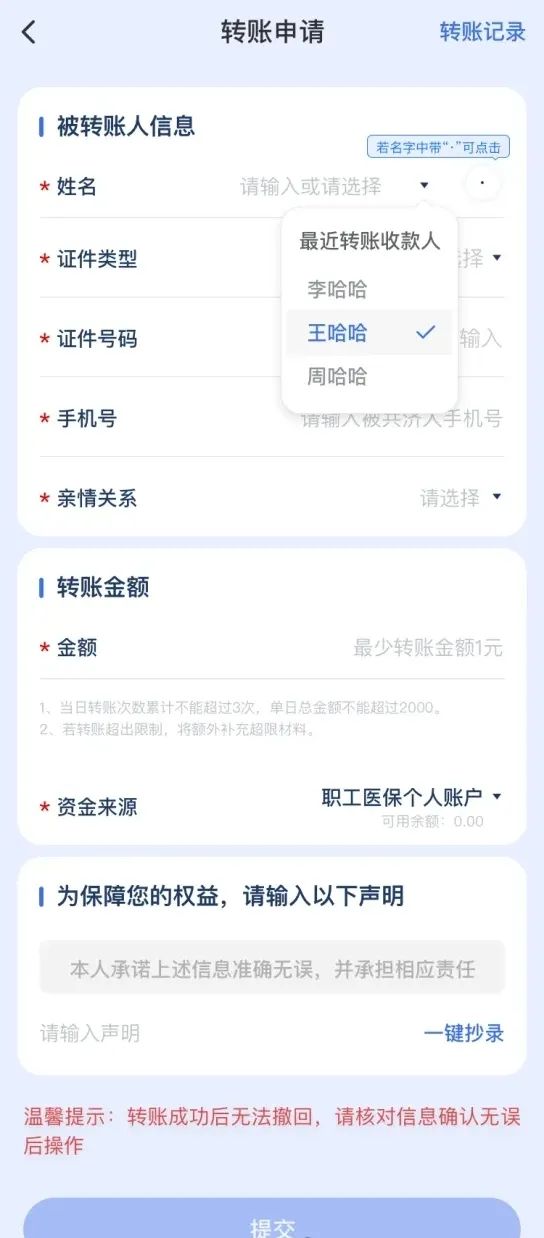 4. 医保个人账户跨省家庭共济如何操作? 第一步:确认使用医保钱包 在手机应用商店中下载“国家医保服务平台”App。 注册登录后,在首页可点击进入“医保钱包”服务界面。 打开“医保钱包”,可查询您和亲人所在的城市是否开通该功能。全国其他城市区域也将陆续开通运行。 注意,使用“医保钱包”,需要转账人和收款人的地区均开通了“医保钱包”功能,才能进行转账。 点击“确认使用钱包”。 选择使用地,填写绑定手机号,点击“立即确认使用”。 第二步:使用医保钱包向家人转账 医保钱包转账是实现近亲属医保个人账户共济的一种方式。使用医保钱包转账功能,个人可将本人医保个人账户或医保钱包中的资金转账至近亲属医保钱包中,供其用于就医购药费用结算、居民医保个人缴费等。使用方式如下—— 登录“国家医保服务平台”App,首页点击进入“医保钱包”专区。点击“医保钱包转账申请”。 按照要求正确填写收款人信息、转账金额等。 确认无误后点击“提交”,进行“人脸验证”/“医保码密码验证”。 完成验证后,即显示转账成功。 5. 如何使用医保钱包支付就医购药费用? 个人可使用医保钱包中的资金,支付在参保地定点医药机构就医购药发生的个人自付医药费用。 通过“国家医保服务平台”App查询服务,“定点医疗机构”和“定点零售药店”,可查询当前已开通医保钱包支付的定点医药机构。